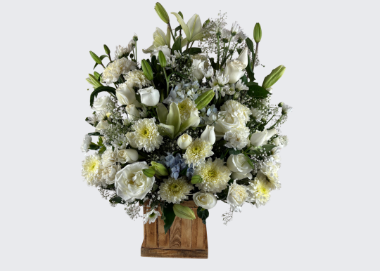 Esta compuesto por rosas, lilis y crisantemos en tonos blancos sobre una base de follajes verde intenso y unos toques de gypsophia.